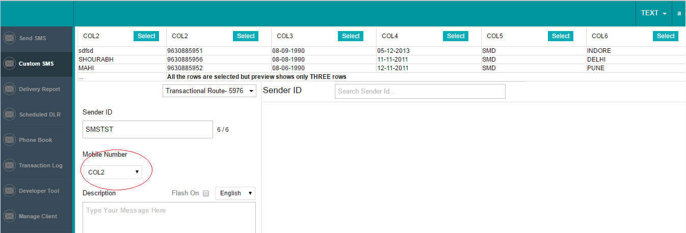 From here you have to select the mobile number value column name. Say in our case mobile number belongs to the col 2. so we have to select the Col 2 from drop down.