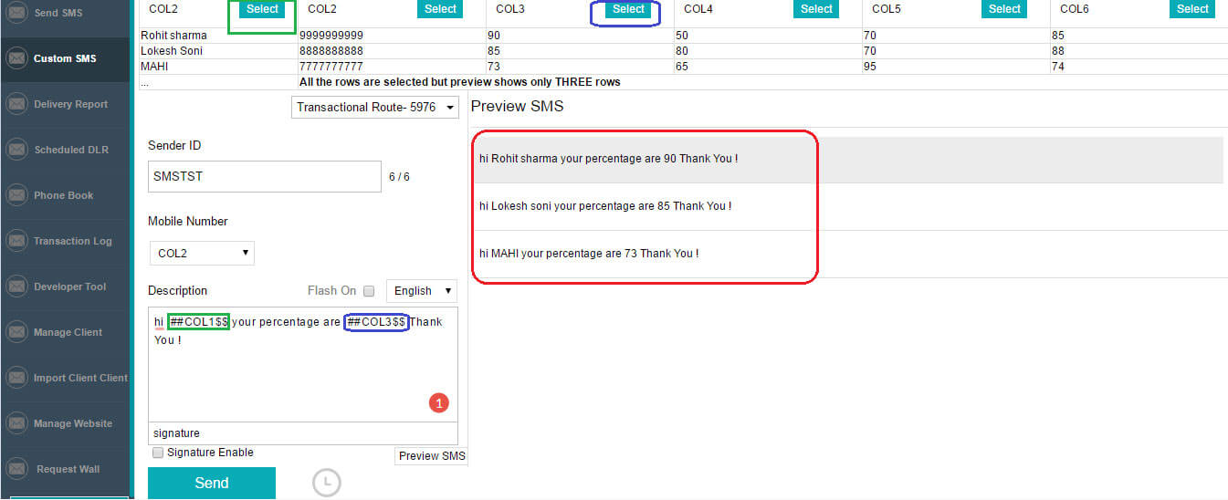 On Rohit Sharma mobile phone that is 9999999999 we need to send message as “Dear Rohit Sharma , you have scored 80 % percentage in your examination” On Lokesh Soni phone that is 8888888888 we need to send message as “Dear Lokesh Soni , you have scored 75 % percentage in your examination”