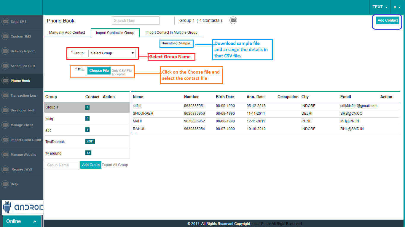 Option 2 :- Import contact in single group :- Just click on the add contact button and then select the import contact in Group tab and then upload the CSV file in the given format.