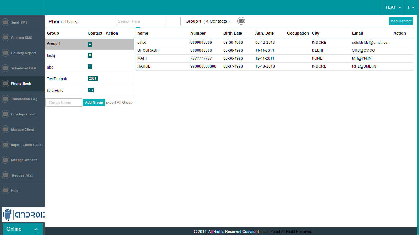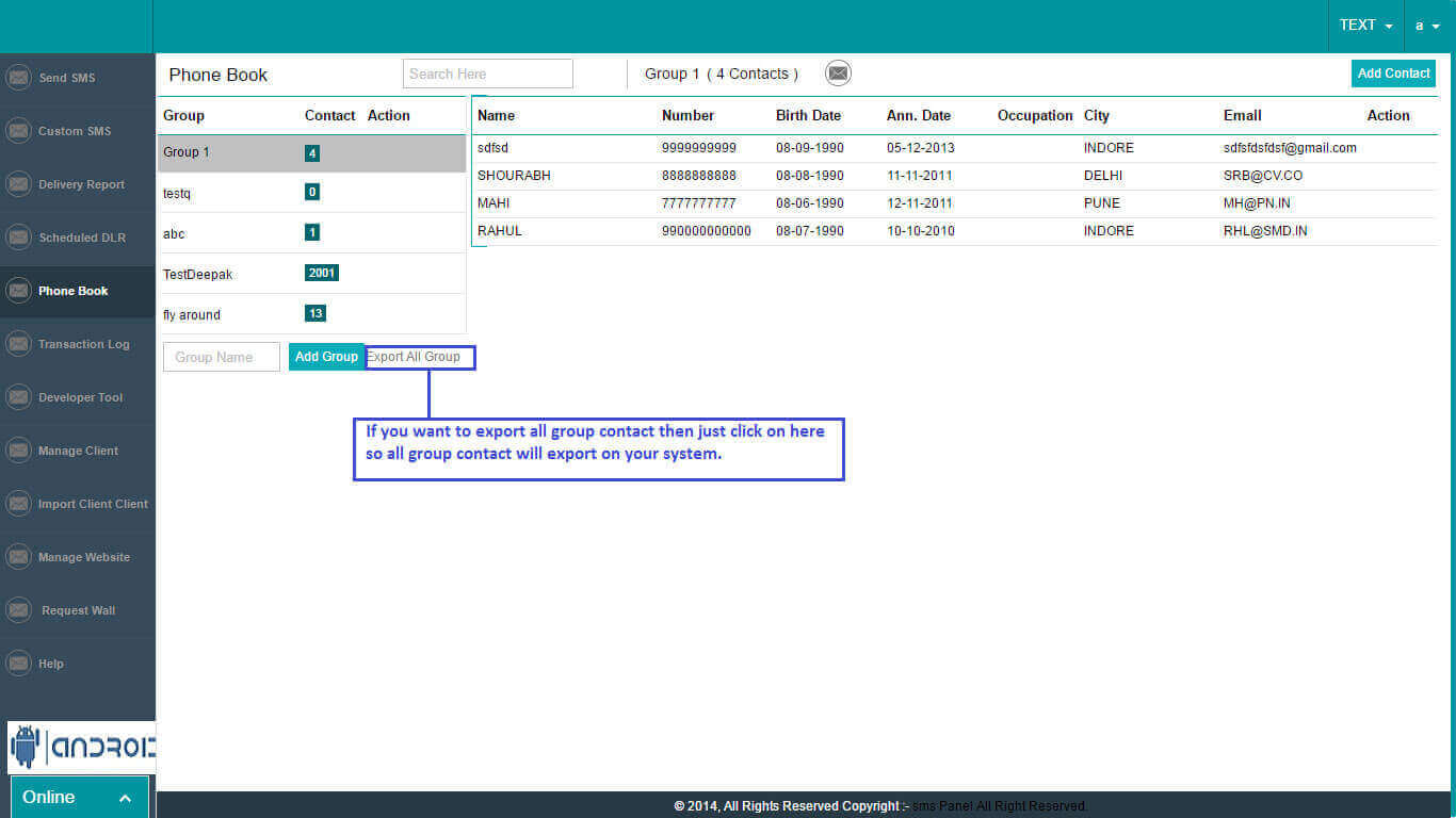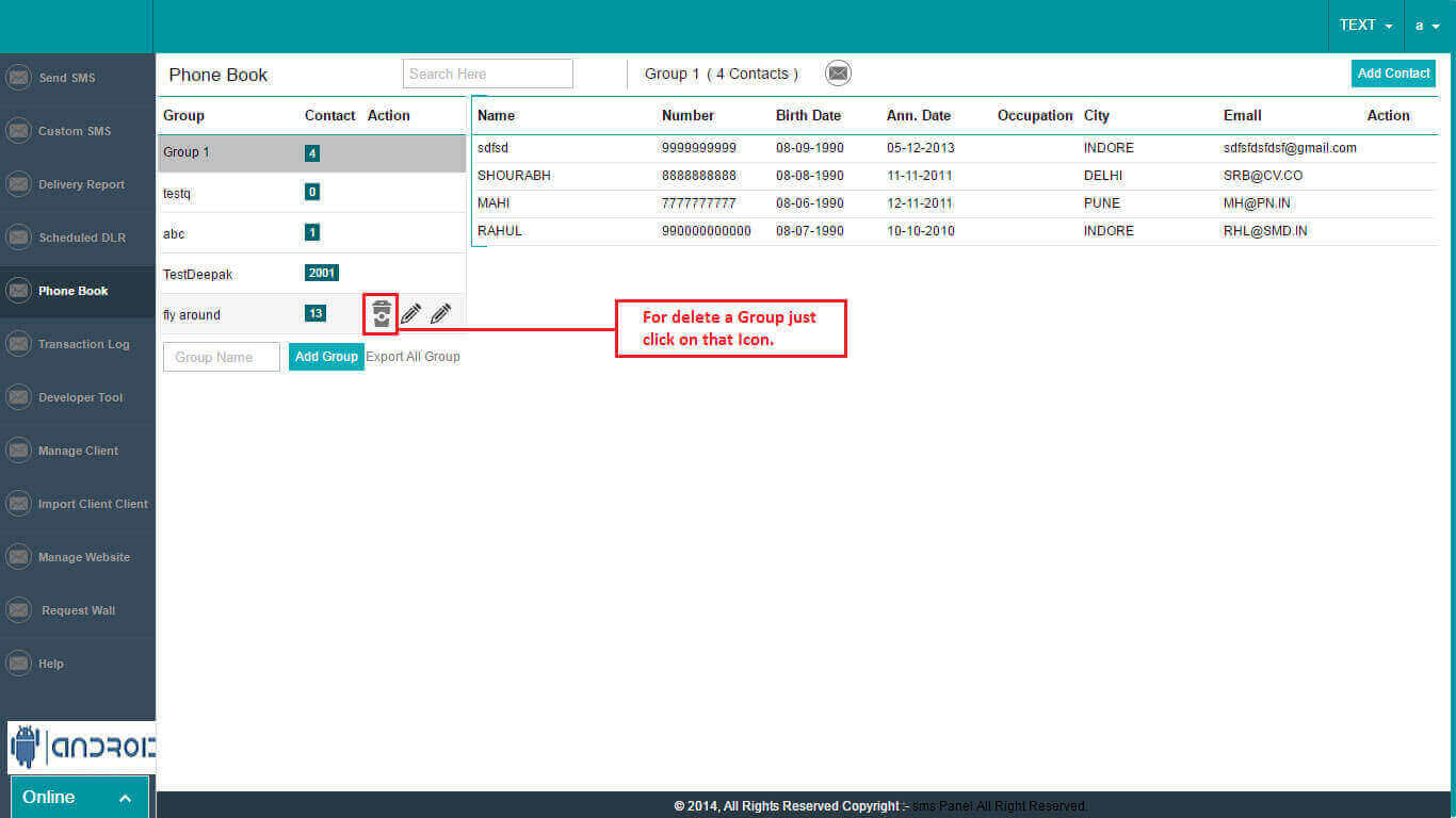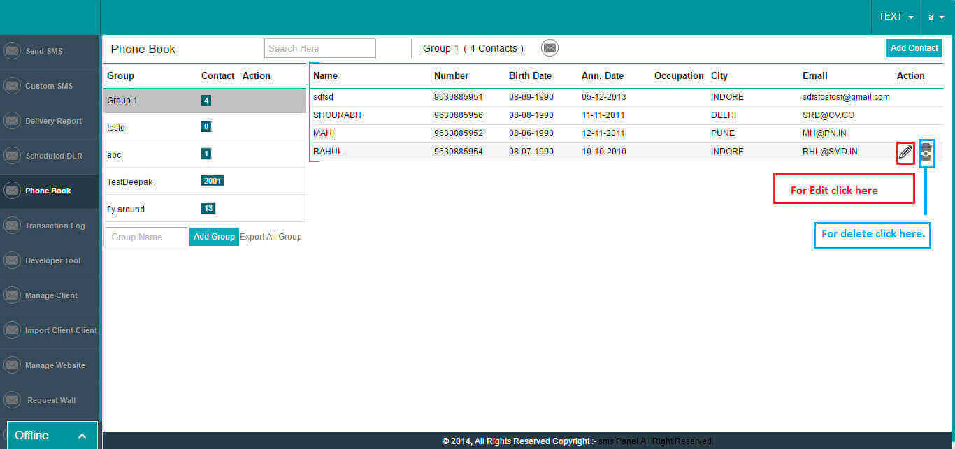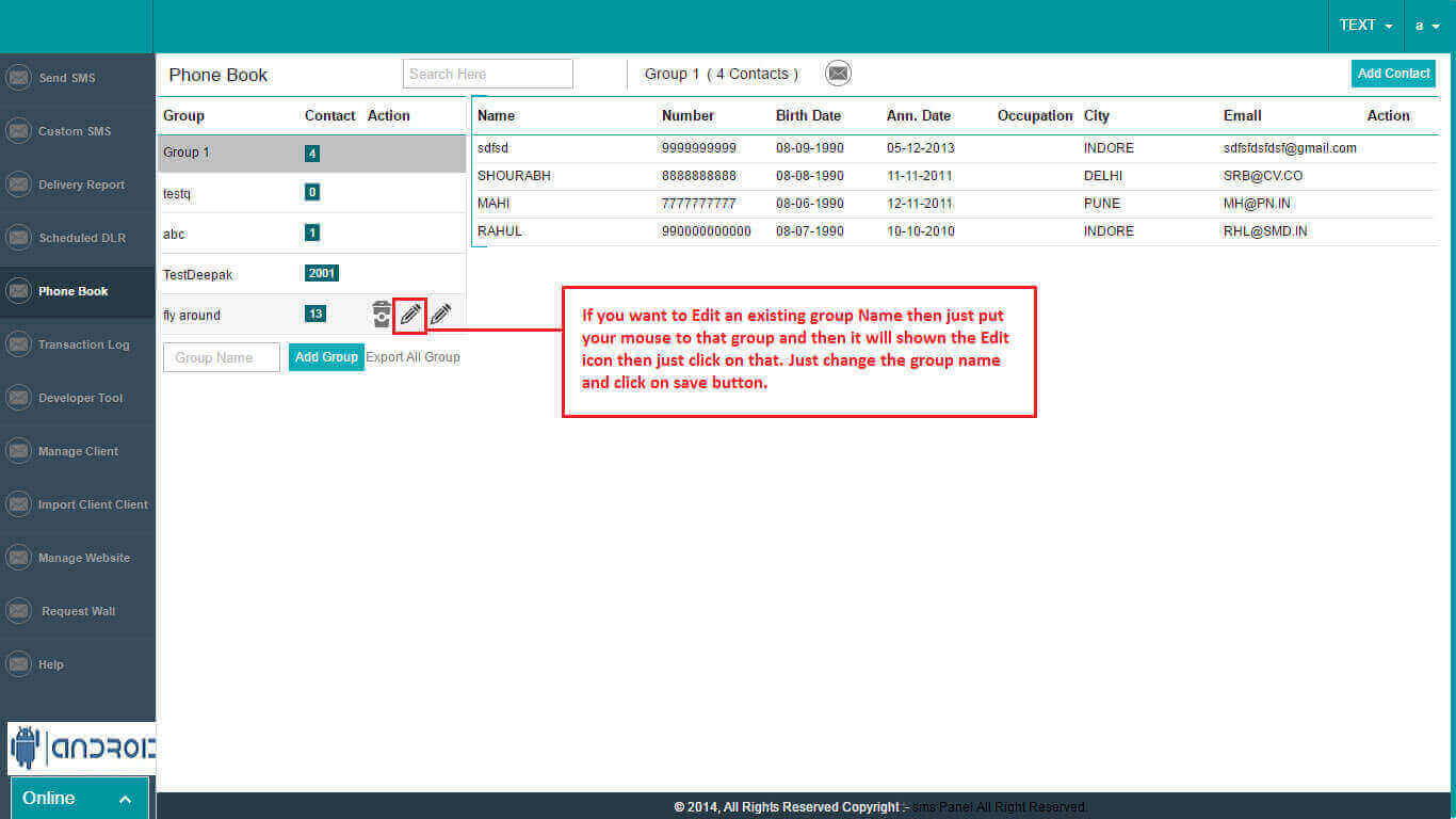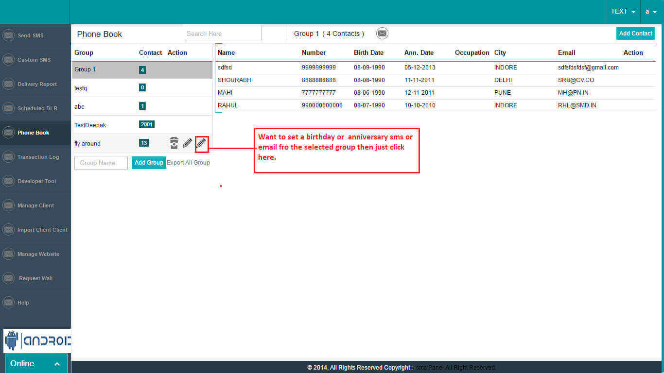 Edit Wish SMs Setting : If you want that an sms or email will send on the group contact on their birthday or anniversary date then that option is useful for you. Just click on the option and set the your sms content and email content which is automatically delivered on the 8:00 AM.