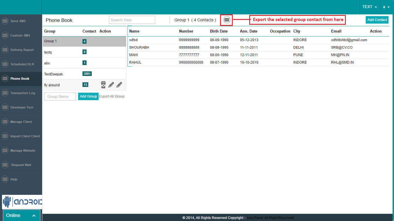 Export Group contact : if you want to Export the existing group contact then just click on that group and then click on the export icon.
